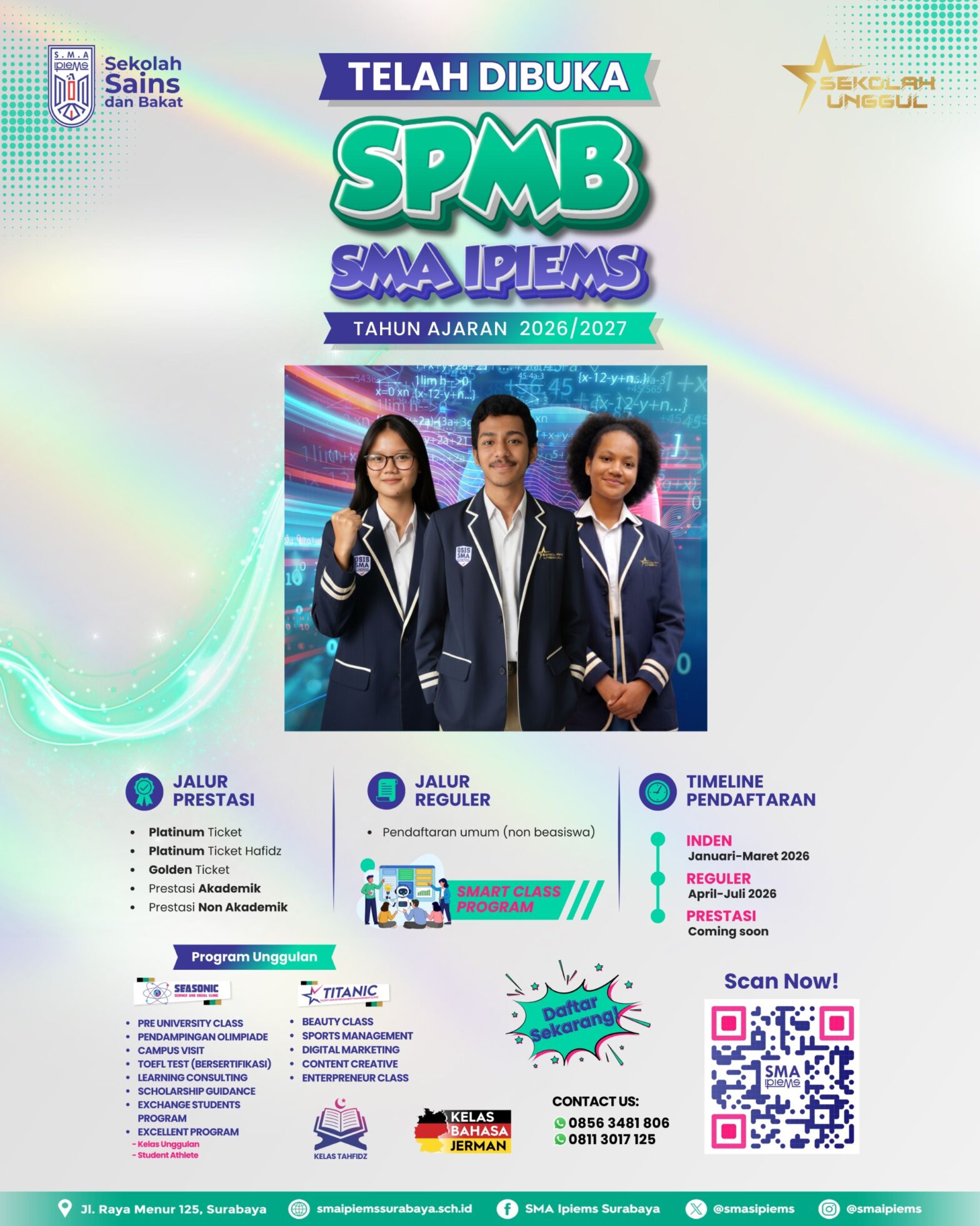 SMA IPIEMS kembali membuka PSPMB tahun ajaran terbaru dengan menawarkan berbagai program unggulan inovatif serta komitmen kuat dalam pengembangan potensi dan bakat siswa. Sebagai sekolah yang terus beradaptasi dengan perkembangan zaman, SMA IPIEMS menghadirkan tiga program unggulan, yaitu SEASONIC, TITANIC, dan SMART CLASS PROGRAM. Ketiga program ini dirancang untuk membentuk peserta didik yang unggul secara… Continue reading TELAH DIBULA SPMB 2026-2027